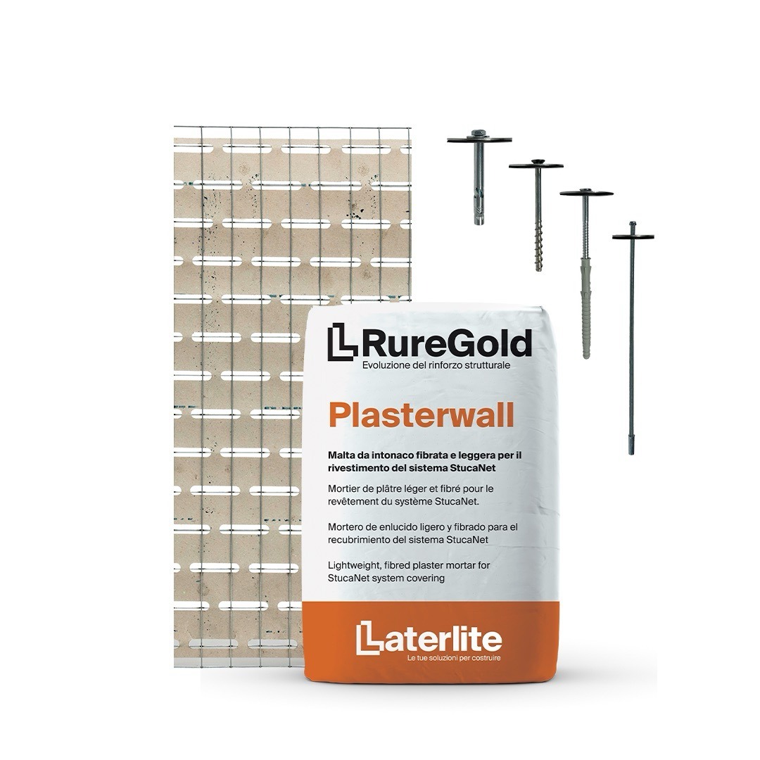 Thanks to over 10 years experience in the field, Ruregold, has developed and certified three complete systems, offering a solution for every on-site need. Each system consists of meshes, fastening systems and plaster mortars, all characterised by ease of application and secure performance.